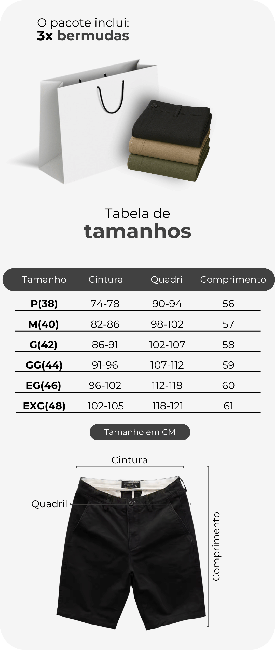 Transforme seu guarda-roupa com o Kit 3 Bermudas. Perfeito para quem valoriza estilo, conforto e versatilidade, essas bermudas são confeccionadas em sarja 100% algodão, proporcionando frescor e elegância nos dias mais quentes.