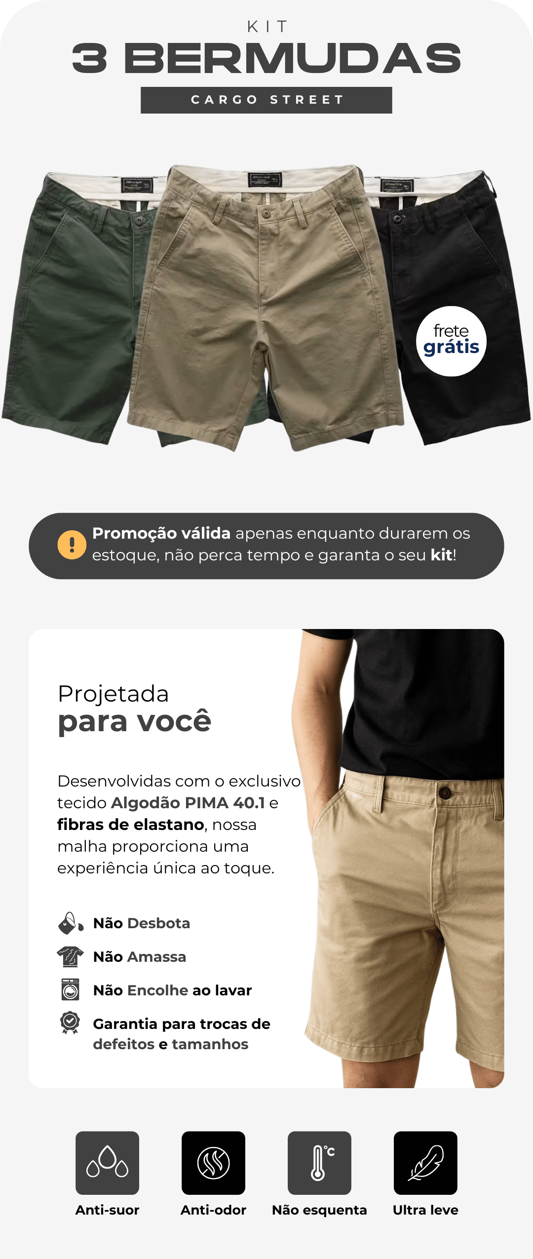 Transforme seu guarda-roupa com o Kit 3 Bermudas. Perfeito para quem valoriza estilo, conforto e versatilidade, essas bermudas são confeccionadas em sarja 100% algodão, proporcionando frescor e elegância nos dias mais quentes.