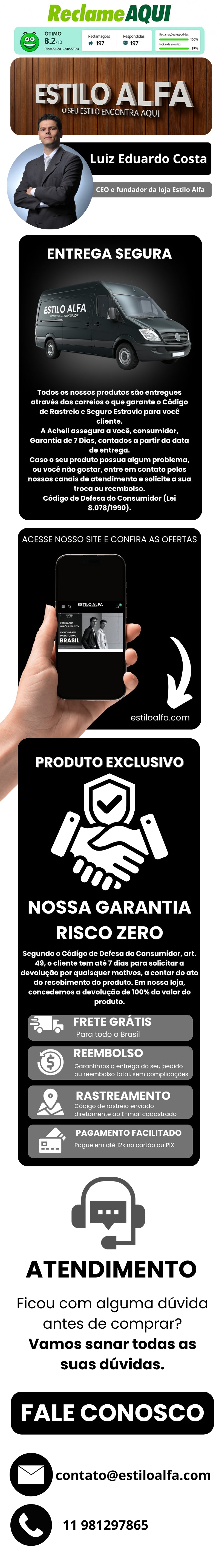 Sabemos que o preço pode parecer surpreendente, mas aqui na nossa loja somos especializados em vendas no atacado, por isso conseguimos oferecer produtos de alta qualidade a preços muito competitivos. Você está comprando diretamente da fonte, garantindo a melhor relação custo-benefício.